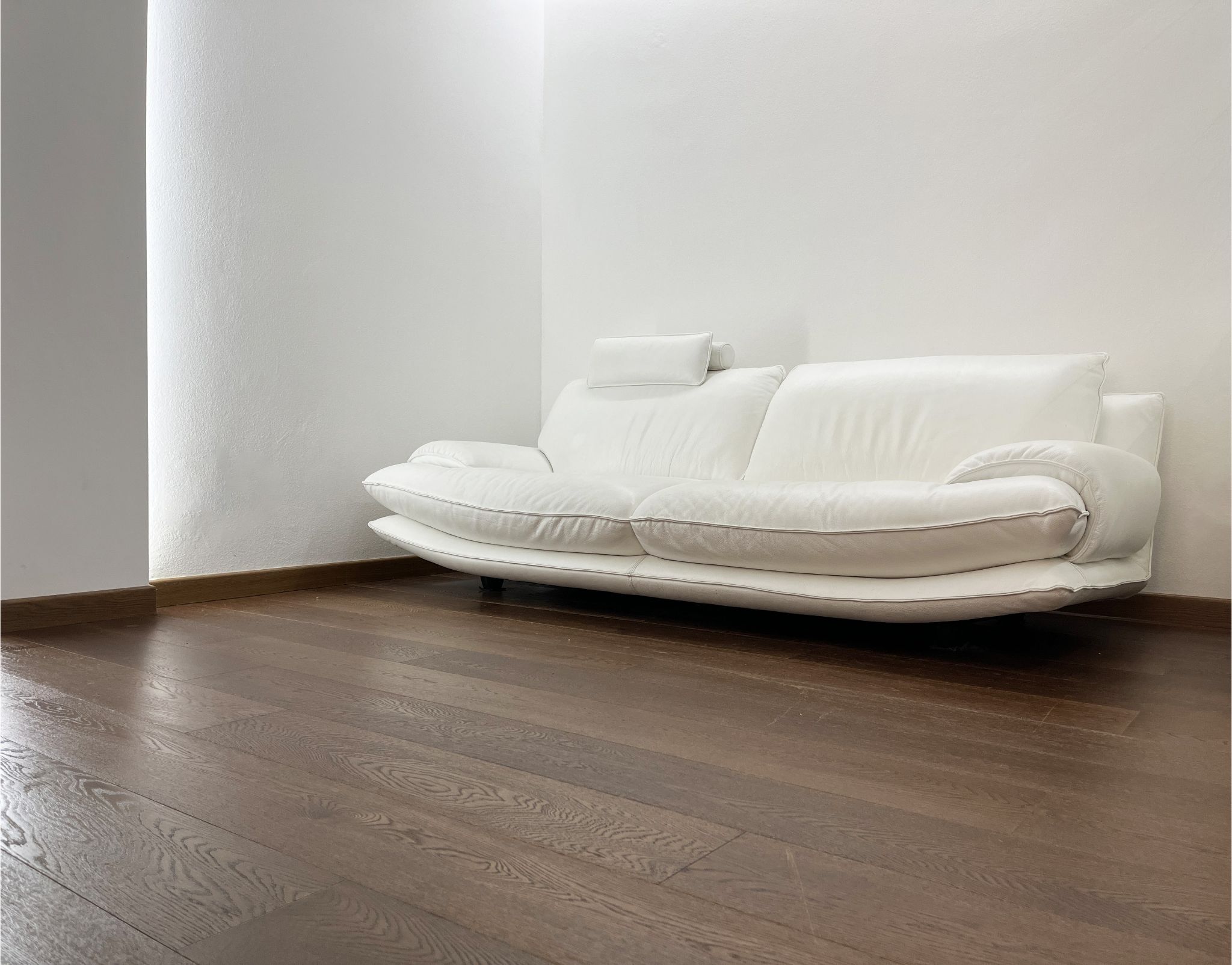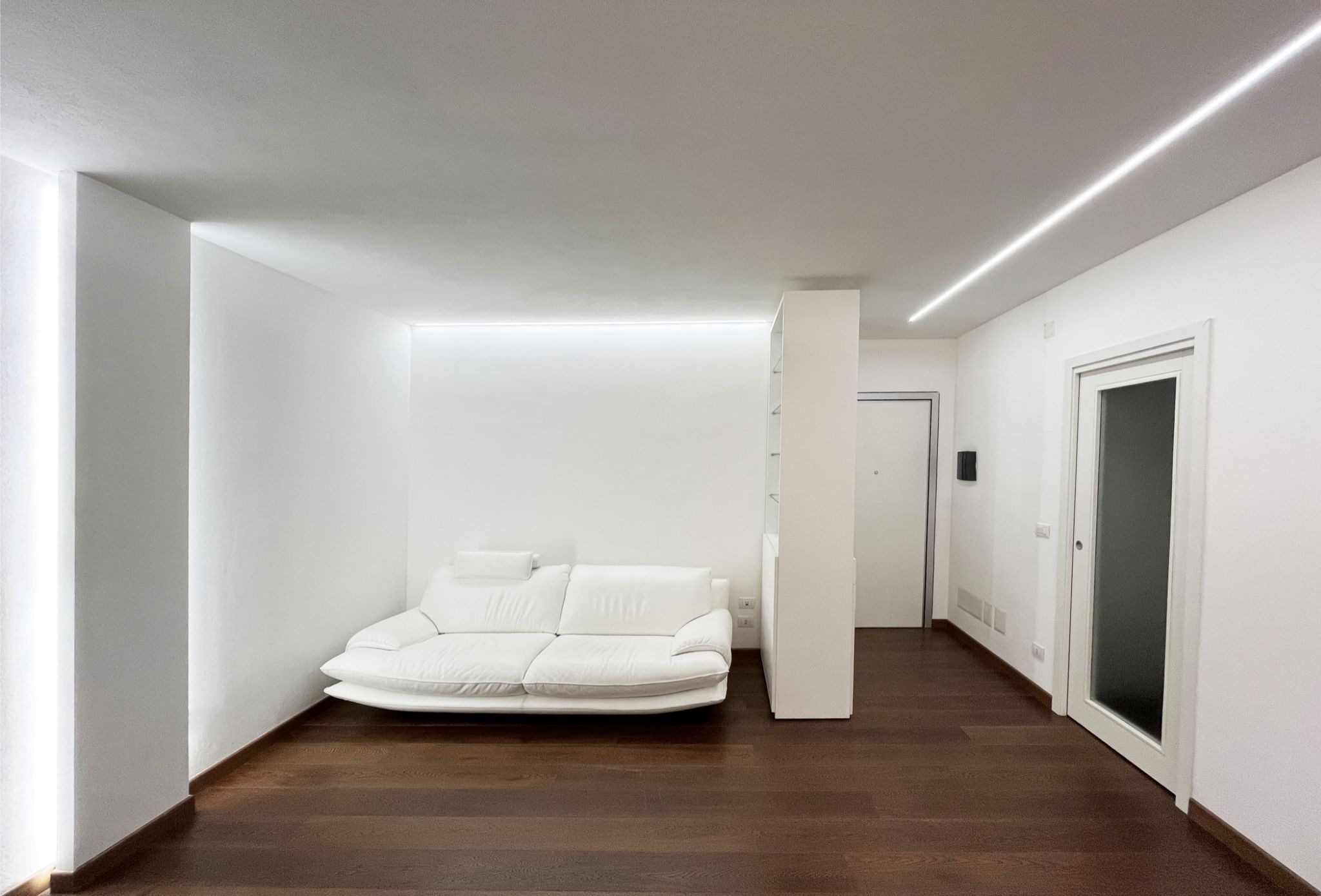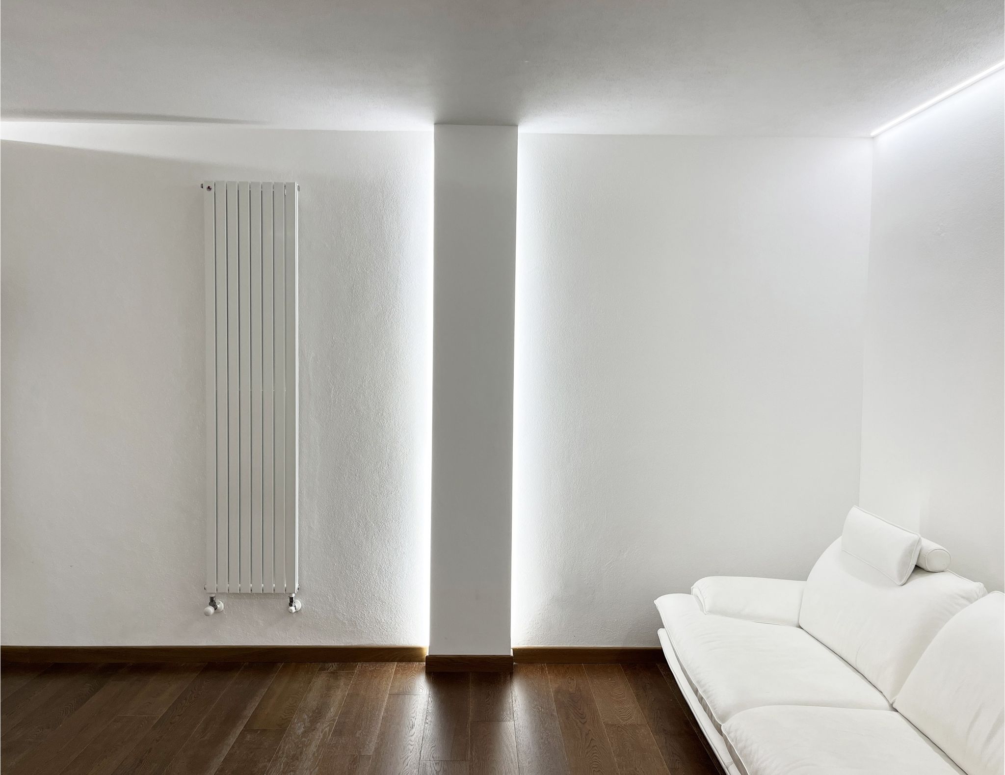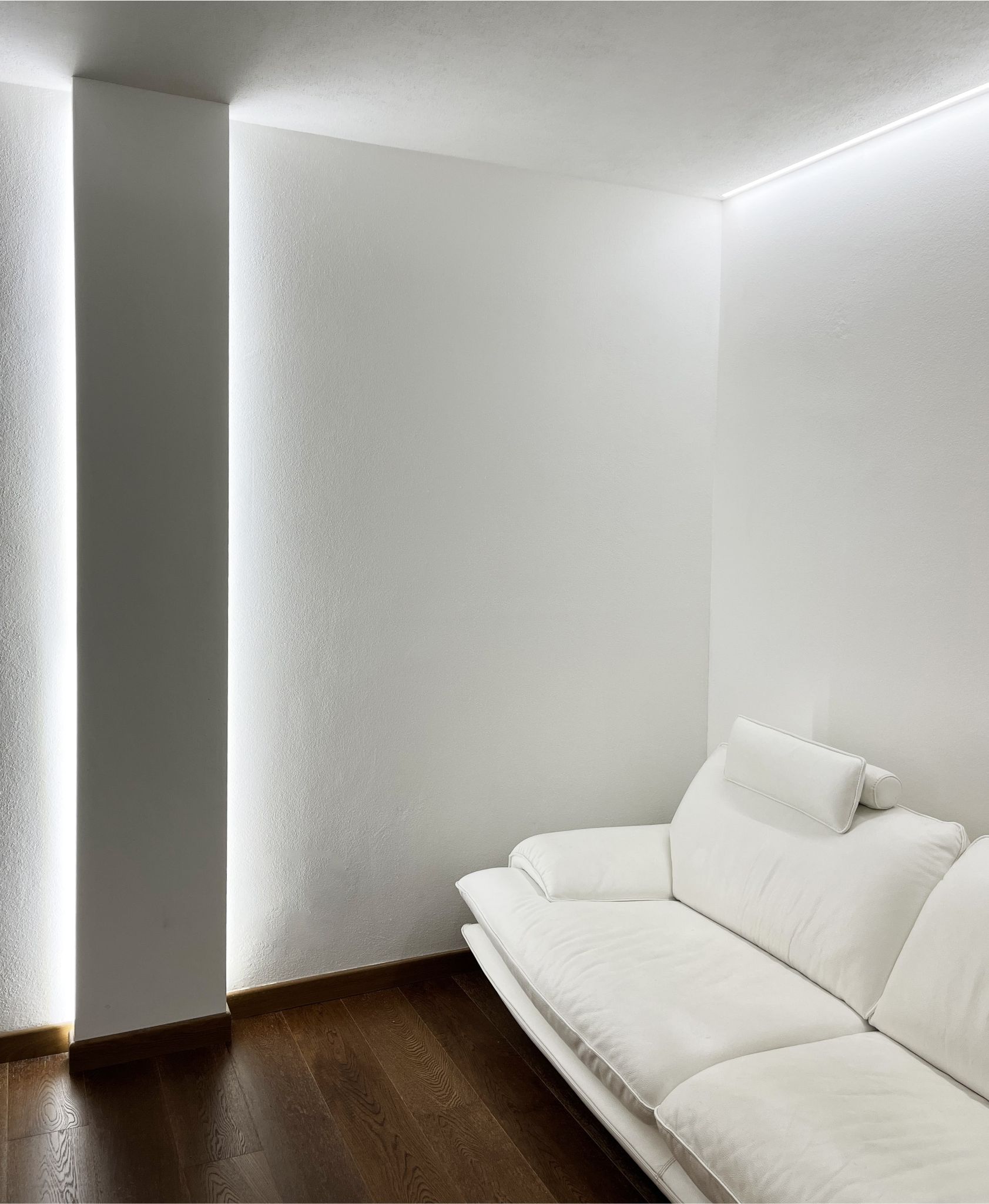 Il progetto illuminotecnico permette di incrementare la luce con delle “cascate di luce” dalle pareti verticali ed orizzontali che delineano la spazialità interna. Interessante il dialogo fra il calore del legno scuro del pavimento in parquet rovere naturale e i tagli chiari di luce a soffitto e a parete.