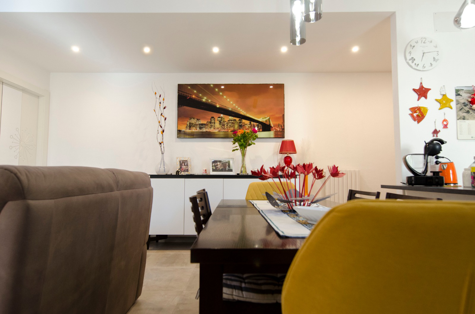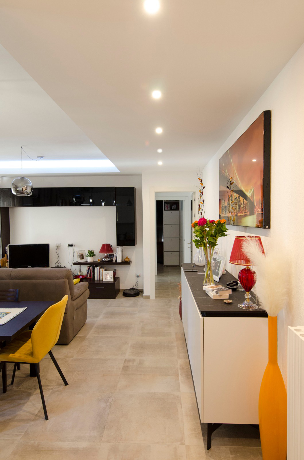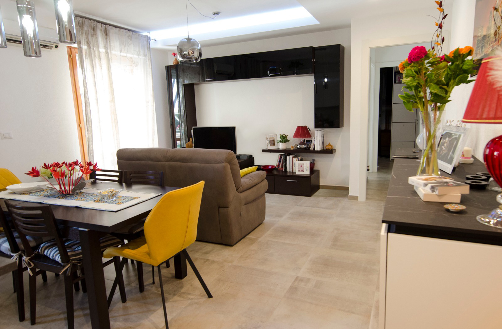Progetto di ristrutturazione di un appartamento a Sassari. L'appartamento era un trilocale, con un angolo cottura angusto e poco fruibile. La committenza aveva bisogno di spazi molto più ampi e luminosi. Attraverso opere di demolizioni e ricostruzioni abbiamo unito la cucina al soggiorno ed eliminato una camera da letto per realizzare un grande open space. Il rifacimento del pavimento in gres porcellanato effetto cemento dona una finitura di alta qualità con un colore tenue che ben si sposa con l’arredamento e la nuova cucina moderna progettata ad hoc da Scavolini. Anche il bagno è stato ristrutturato completamente compresi gli impianti, ed ampliato per renderlo più fruibile eliminando la vasca in favore di un piatto doccia walk-in ed un placcaggio con ceramiche Rondine di colore beige liscio e con effetto 3D nella doccia e davanti alle mensole per il lavabo. La controsoffitatura in cartongesso con illuminazione tramite faretti e la veletta con strip led conferisce inoltre ai nuovi ambienti un'illuminazione di gran classe in chiave contemporanea.